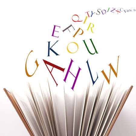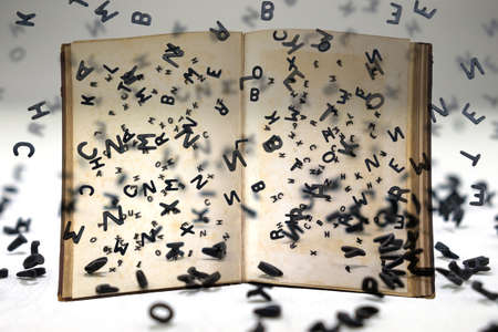 Letters of the alphabet in levitation in the air over the open book pages
