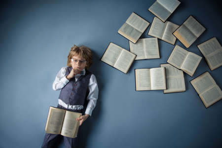 Little boy with books in studio