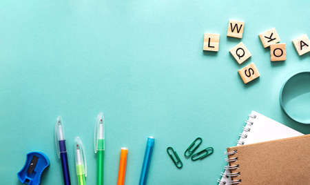 The concept of back to school. Pens, pencils and English letters lie on colored paper