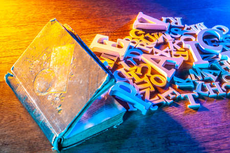 Ancient book. Words and letters. An open book on the table. Reading literature.