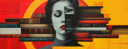 Abstract Art: Woman's Face Hidden by Stack of Books on Red and Yellow Geometric Patterns