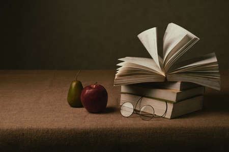 Still life: opened book, glasses and fruits on table