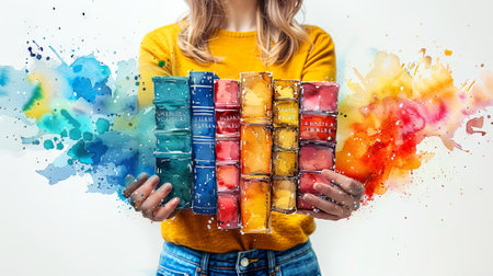 Woman holding a stack of books in her hands. Colorful books in female palms. Concept of reading, knowledge, education, and library collection. Watercolor illustration. Aquarelle splash