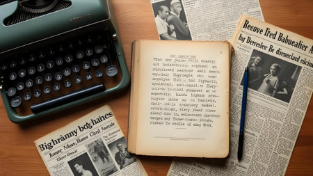 Typewriter and aged books with handwritten text, symbolizing storytelling, classical literature and education