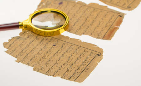 Book pages with an Arabic manuscript on a table with a light and a magnifying glass. Paleography, the study of ancient Arabic writing