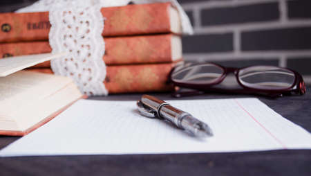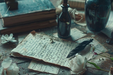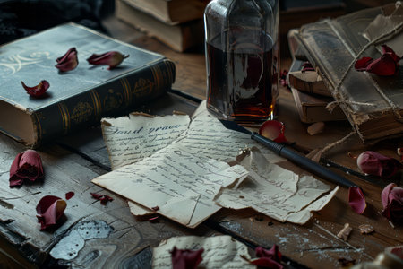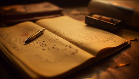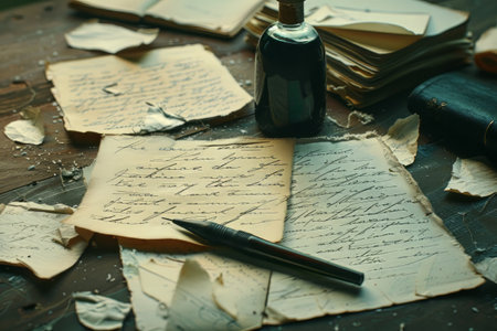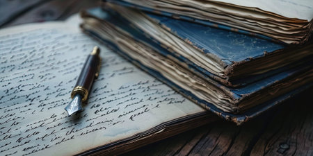 A vintage scene featuring aged books, an elegant ink pen, and handwritten pages on a rustic wooden table evokes nostalgia and creativity, perfect for educational or literary themes.