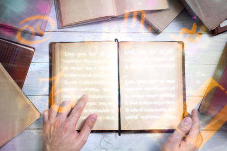 Hands hold Vintage open Book Glows on black background. Concept of reading, knowledge and open mind