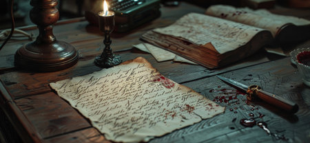 A blood-stained letter with old-fashioned handwriting, lying on a wooden desk with a dim lamp