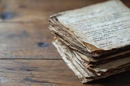 Old handwritten documents stacked on a rustic wooden table revealing historical writing and aged paper texture