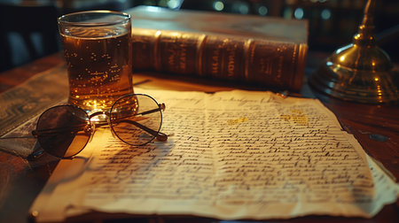 A Glass of Beer, Glasses, and Handwritten Manuscript on a Wooden Table