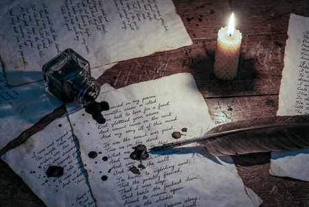 Quill, inkwell with spilled ink, and aged parchment with handwritten text illuminated by a candle
