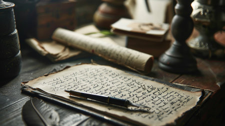 Elegant fountain pen lies on an open antique Arabic book, suggesting scholarly pursuits and historical significance