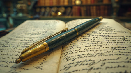 An antique fountain pen, shot close-up with selective focus on the background of old book spines. Writing craft.