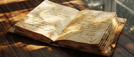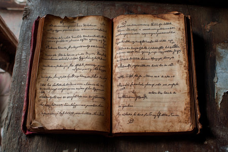 An aged book lies open on a weathered wooden surface, revealing delicate, handwritten script in a cozy, dimly lit setting, evoking a sense of history and nostalgia.