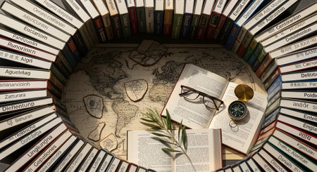 Books in a circle with a compass, glasses and a book.