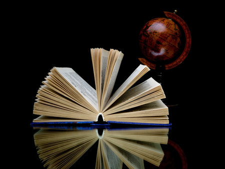 close-up of open book and globe on black background with reflection