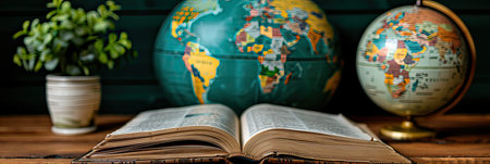 A wooden table has an open book on it with colorful flags and a globe in the background, emphasizing the themes of knowledge, exploration, and diversity