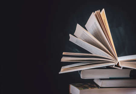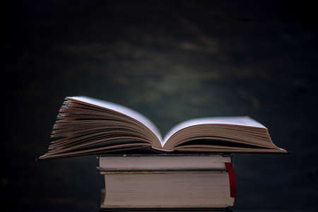 Open book on a stack of books on a table on a dark background. Education and reading of paper books. Exam preparation in schools and colleges