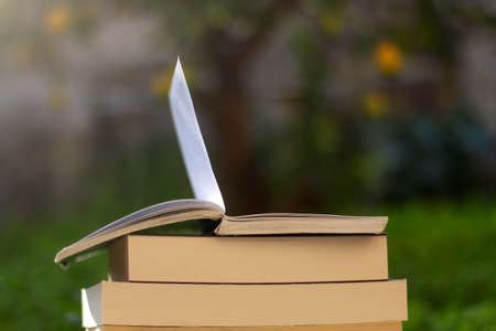 Stack of books in the garden. Selective focus.