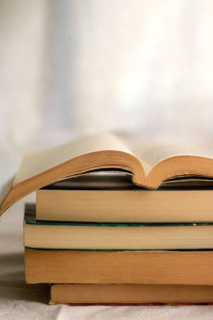 Stack of books. Open book on top. Selective focus.