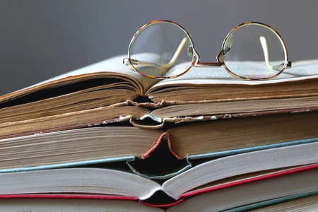 Stack of open vintage hardcover books and retro reading glasses on top. Selective focus.
