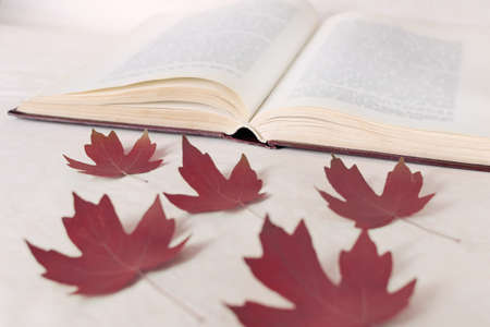 Red maple leaves lie in front of an open book. The concept of starting education and returning to school