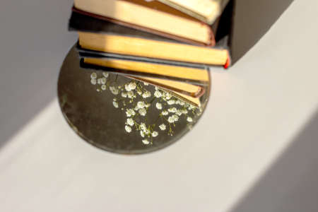 three old books lie with white gypsophila flowers and a round mirror on the table in the sunlight