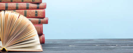 Literature, reading concept: banner or header image with stack of antique books against a dark background