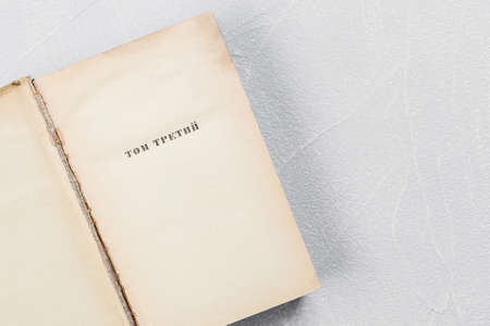 Page of an open old shabby yellowed book with blank sheets of vintage paper with the inscription in Russian Volume Three.