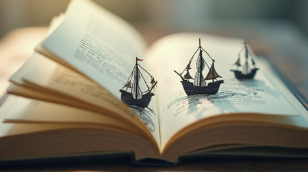Whimsical book with miniature sailboats sailing on pages, evoking imagination and adventure