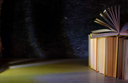 A stack of old books. Vintage book on wooden table. Magic lightning around a glowing book in the room of darkness. Selective focus
