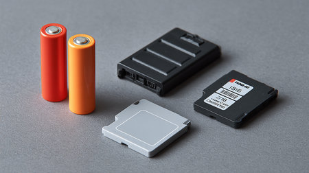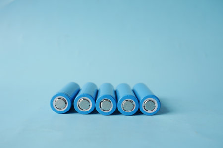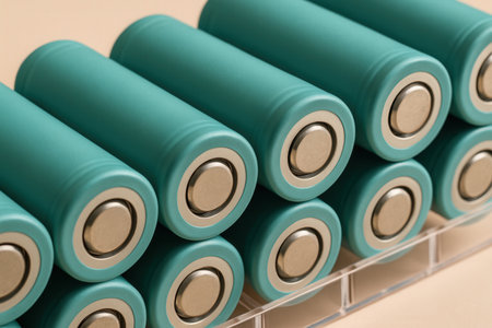 Close-up of modern batteries showcasing sleek design with metallic finish. Ideal for energy-related projects or technology themes in stock photography.