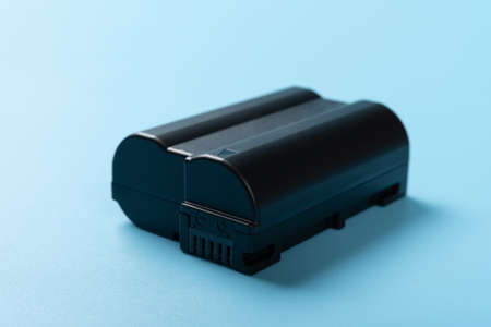A pack of new modern high-capacity lithium-ion cells. A prototype of new batteries on a laboratory table with UV light.