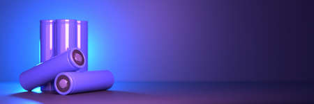 5 purple cylindrical batteries, copy space. Wide purple banner with space for text for advertising or announcement. Rechargeable li-ion batteries for electrical appliances and devices