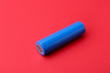 A single rechargeable battery on blue background. Silver alkaline AA battery for different device. Energy.