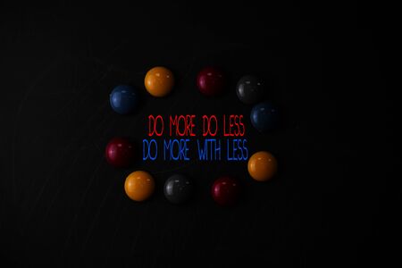 Conceptual hand writing showing Do More Do Less Do More With Less. Concept meaning dont work hard work smart be unique Round Flat shape stones with same sizes stick black board