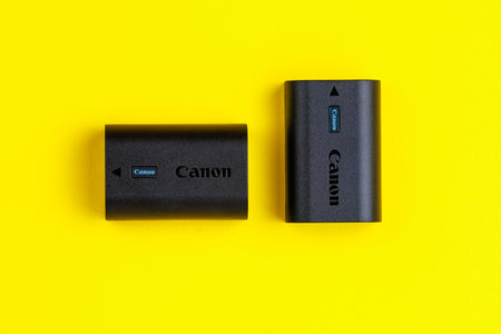 August 30, 2023 Chisinau Moldova. Two lp-e6NH battery for Canon camera. Background with copy space for text