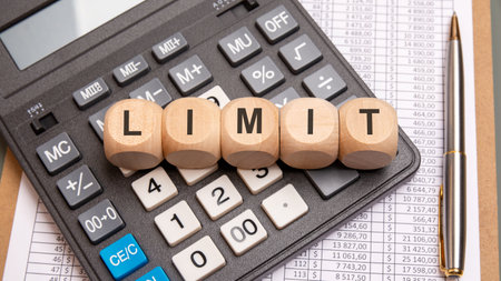 the word LIMIT formed with wooden blocks placed on a calculator, surrounded by financial spreadsheets and a pen. concept of financial limits, budgeting, and business constraints.