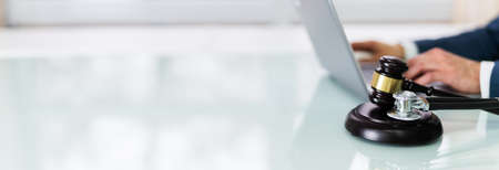 Close-up Of A Businessperson's Hand Using Laptop With Gavel On Desk