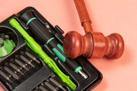 Law theme, mallet of the judge, wooden desk,
