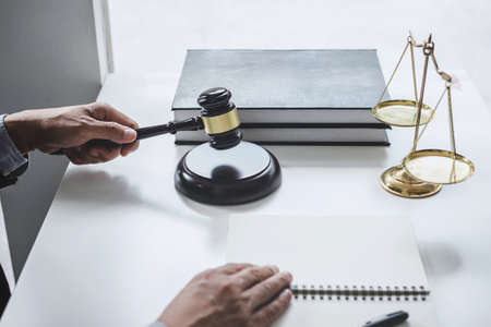 Close up of gavel, Male lawyer or judge Consult with client and working with Law books, report the case on table in modern office, Law and justice concept. Top view.