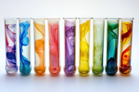 Test tubes filled with colorful chemical substances creating swirls in laboratory setting