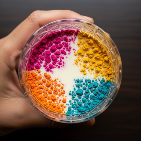 Close-up of a Petri dish containing a colorful microorganism culture on a lab surface, highlighting the intricate growth patterns under lab lighting.