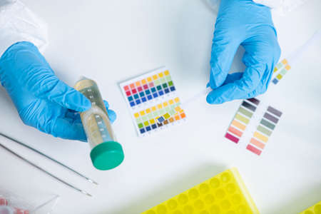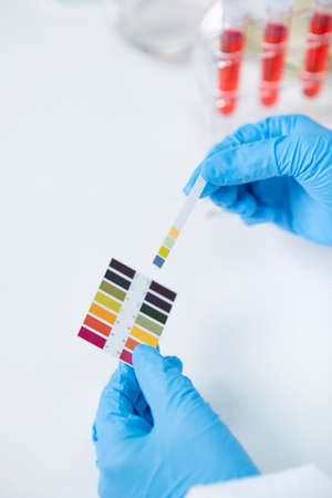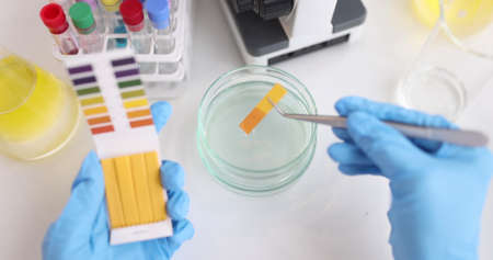 Close-up. Lab technicians hands in medical gloves, holding a litmus or reagent paper, conducting PH test, measuring the acidity or alkalinity of substances in a Petri dish in medical study laboratory