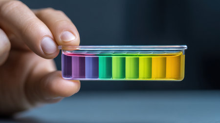 A hand holds a test tube with vibrant colored liquid samples arranged in a transparent holder, showcasing a gradient effect ideal for educational or research purposes.