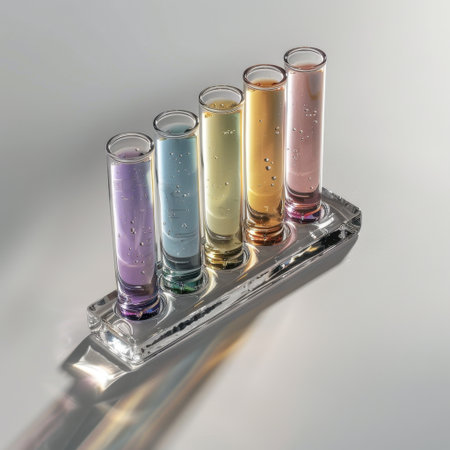 This image features a sleek rack holding five test tubes filled with colorful water, each displaying bubbles that catch the light beautifully. Perfect for scientific themes.