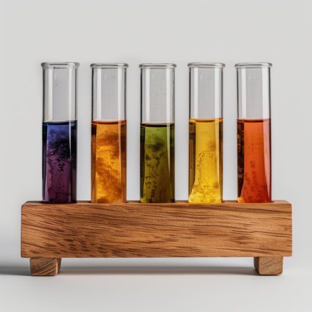 A set of vibrant liquid samples displayed in glass test tubes on a wooden holder, perfect for illustrating chemistry experiments, laboratory work, and scientific concepts.