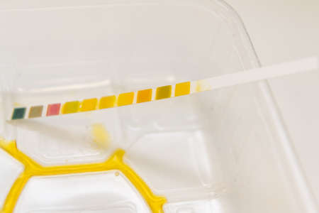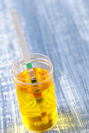 Conceptual image on urin alysis, dipstick placed on the vials of urine