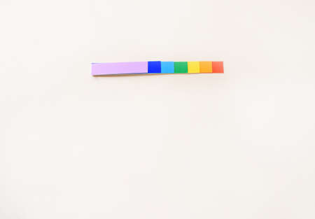 set of colorful sticky notes or paper tags and ruler on mint green notebook - selective focus
