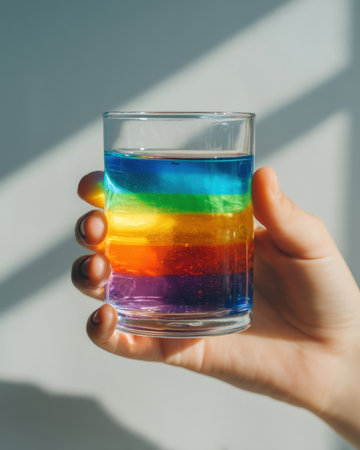 clean shot of hand holding glass filled with colorful liquid, isolated on bright background, strong contrast and room for text, Generative AI